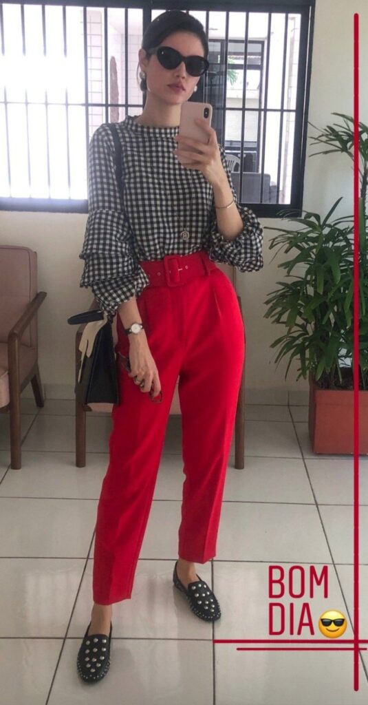 The ruffled gingham three quarter sleeve blouse tucked into high waist belted red trousers with studded black loafers is so unapologetically bold. Two patterns that should not work together somehow absolutely do because the black and white of the gingham neutralises rather than competes with the red. Big cat eye sunglasses and a structured black bag finish this off perfectly. For anyone who wants to look genuinely memorable, this is the outfit.