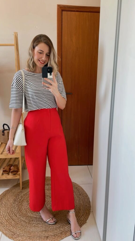 Sometimes the most reliable combinations are the ones you already know. Black and white Breton tee with red wide leg culottes and silver flat sandals is so easy to recreate and photographs so well in natural light. A cream baguette bag keeps the accessories feeling fresh and light. The red lip in the mirror reflection is not accidental and I respect it entirely. This is a go to combination that will genuinely never let you down.
