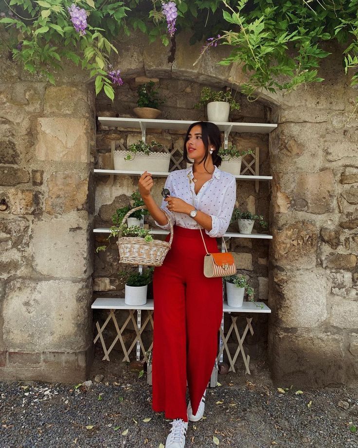 The white polka dot button shirt loosely tucked into red wide leg trousers with white Adidas trainers and a stripe and orange crossbody bag is so charming and springlike. The dot print adds pattern without overwhelming the boldness of the red. A wicker basket and pearl studs complete the whole romantic French countryside moment. This is genuinely the most picturesque outfit in this guide and so easy to recreate.