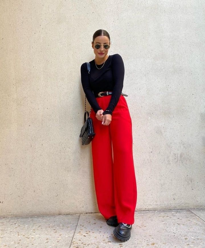 For anyone who finds red trousers intimidating, this is your entry point. A fitted black long sleeve bodysuit belted at the waist of wide red trousers with chunky black boots and a black quilted bag keeps everything looking very sharp and controlled. The monochrome black accessories essentially frame the red so it feels bold but not chaotic. Add gold rimmed sunglasses and a gold chain necklace and you are genuinely done.