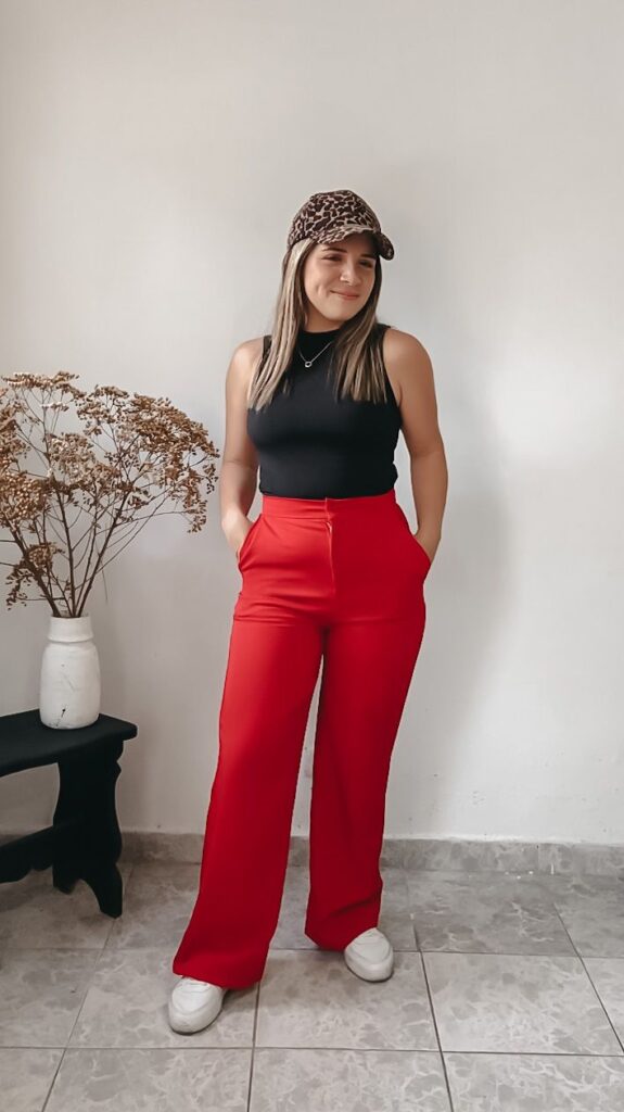 So the high neck black sleeveless top with red wide leg trousers and white trainers is already a clean and wearable combination. But that leopard print cap on top? That is what makes this specific look memorable rather than just nice. It adds personality and playfulness without disrupting the clean colour pairing underneath. So if you have a printed cap sitting around feeling neglected, this is exactly the outfit it needs.