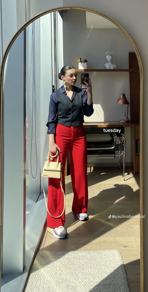 So this person woke up on a Tuesday and decided to actually try. The fitted navy pinstripe button up tucked into red flare trousers with chunky trainers and a tiny cream micro bag is genuinely such a good combination. The statement earrings and round glasses are doing a lot of the personality work here. You ought to try this colour pairing if you usually reach for navy and black together, because red makes it so much more interesting.