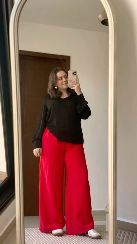 For the days when you want to wear the red trousers but have genuinely no energy to think about it, this is the outfit. An oversized black sweatshirt with wide red trousers and chunky trainers is comfortable, wearable and still looks considered because the colour contrast does all the work. Small gold hoop earrings are the only accessory you need. Honestly this is one of the most underrated combinations in this guide.