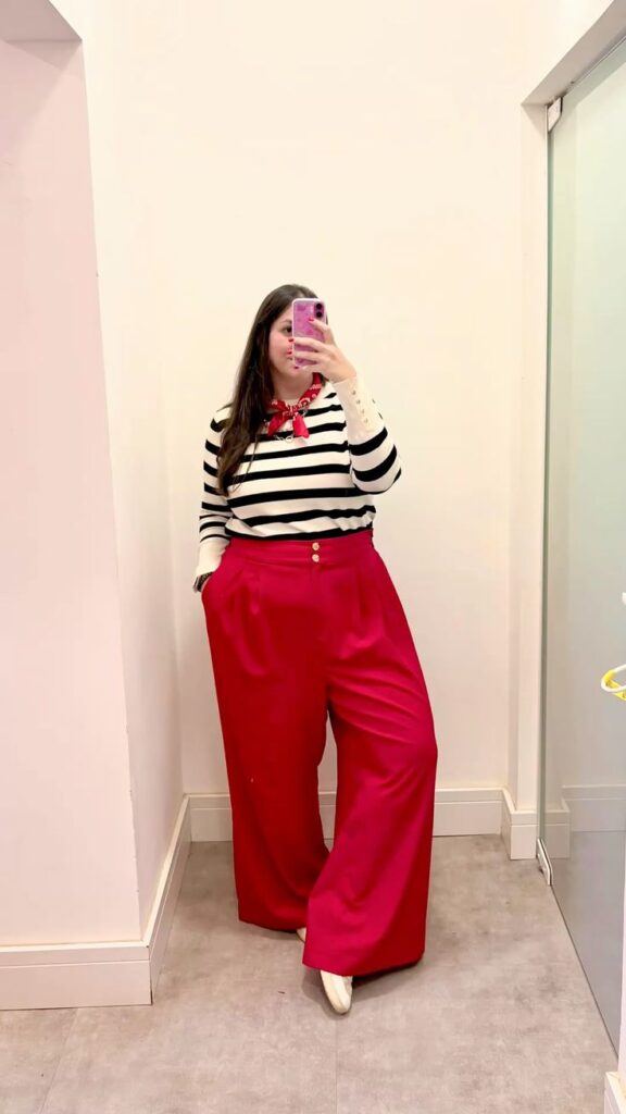 Honestly this combination has been working since forever and it still does. The black and white Breton knit tucked into high waisted red wide leg trousers with a red bandana at the neck is so classically French it almost feels cinematic. White pointed flats keep it clean and polished. The gold buttons on the waistband are such a small detail but they make the whole outfit feel intentional and elevated.