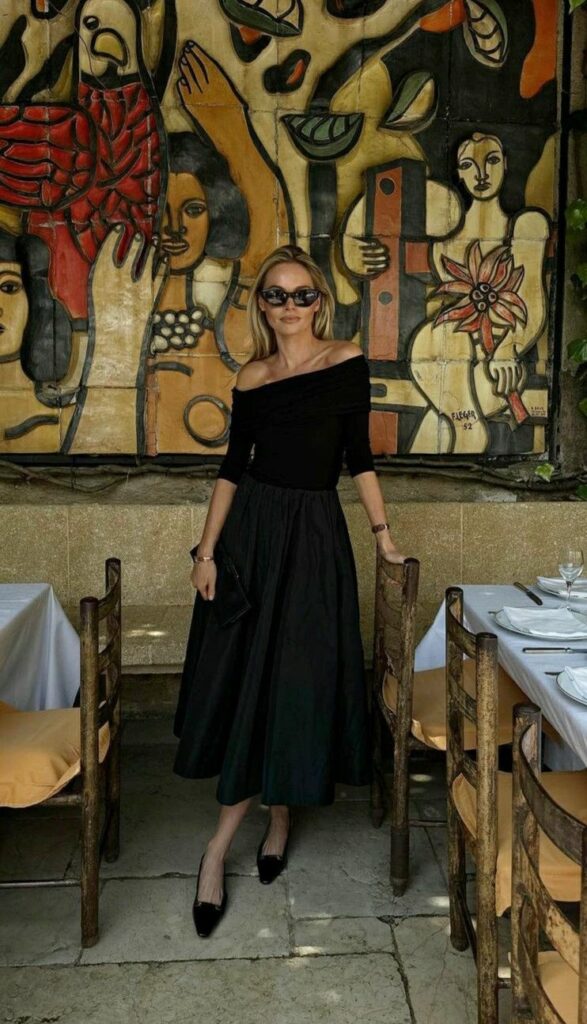 The off shoulder top paired with a full midi skirt keeps the silhouette soft and classic, and the pointed black flats pull it all together without adding unnecessary height.