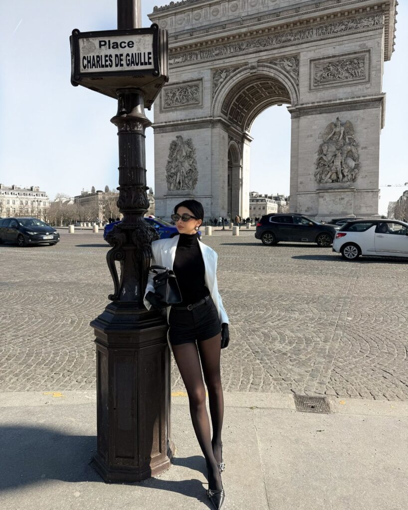 Sharp white blazer over a black turtleneck bodysuit with fitted shorts, sheer tights and embellished pointed flats is the kind of contrast combination that always photographs well, always reads as intentional and always turns heads.