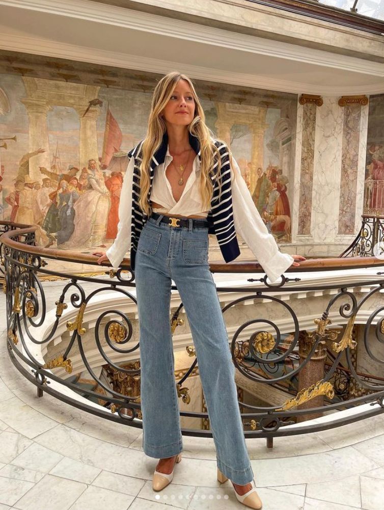 Wide leg jeans usually need help looking intentional, so here’s the tip: pair them with a knotted white blouse, drape a striped knit vest over your shoulders and add a logo belt for structure.