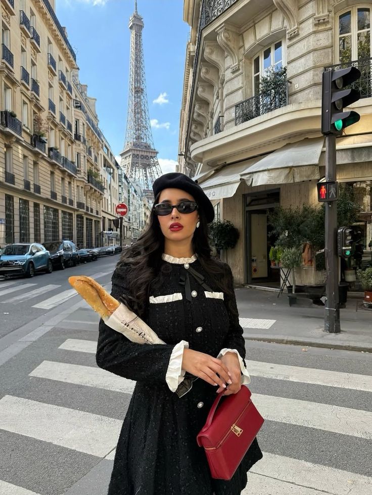 Red lip, red bag, little black beret — it’s giving old money Parisian without trying too hard.