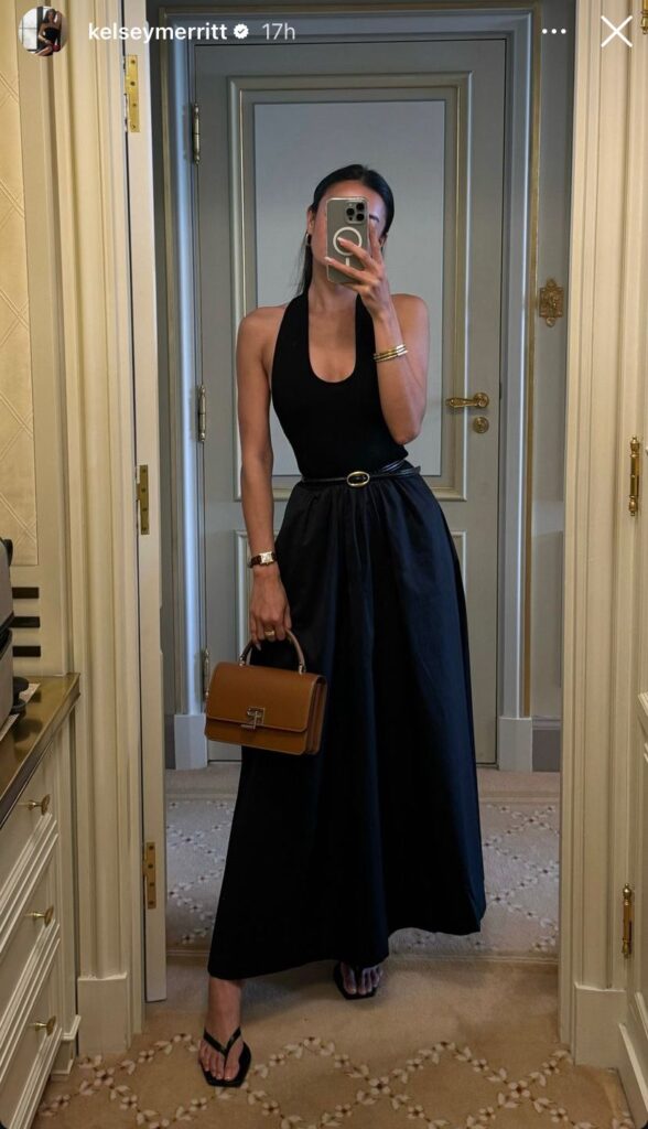 The halter neck bodysuit tucked into a full midi skirt with a thin leather belt is so quietly elegant it almost feels unfair.