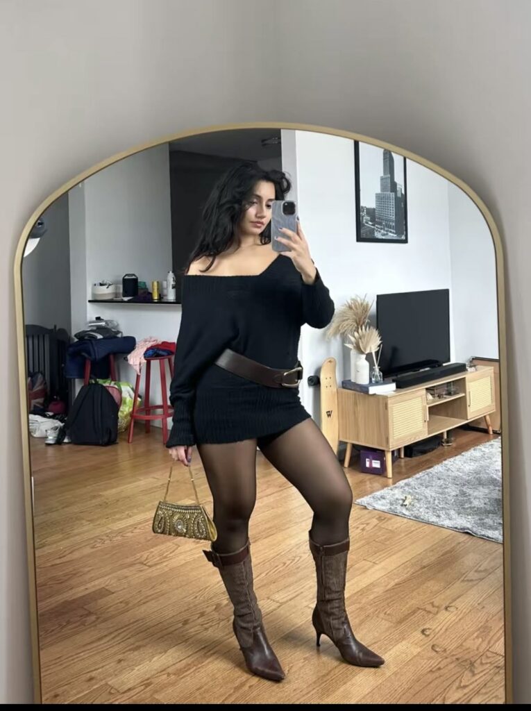 An oversized off shoulder knit belted over a mini, sheer tights, and those brown heeled boots are doing so much for the overall silhouette.