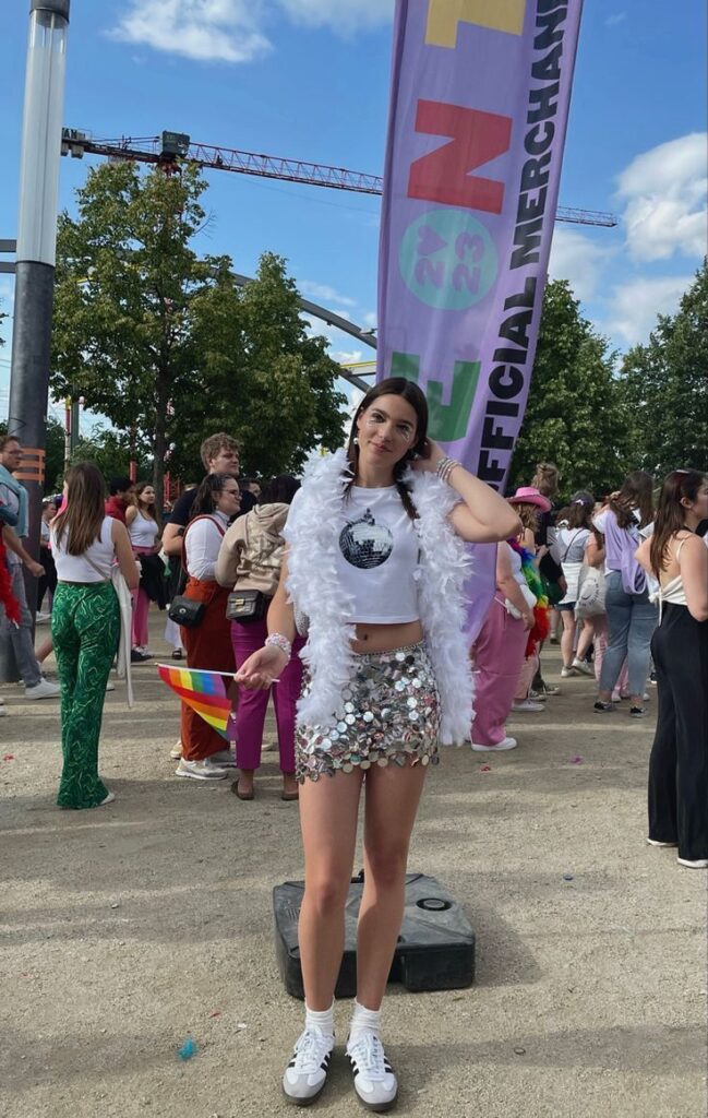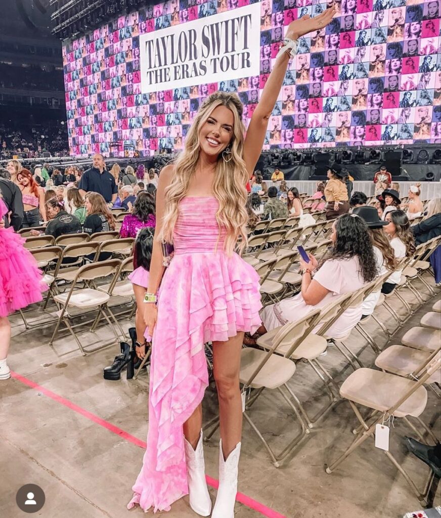 This one is sweet and low pressure and honestly that’s its whole power. A glittery pink tiered ruffle skirt with a simple white tank and white boots gives you full Swiftie energy without the stress of a head to toe costume.