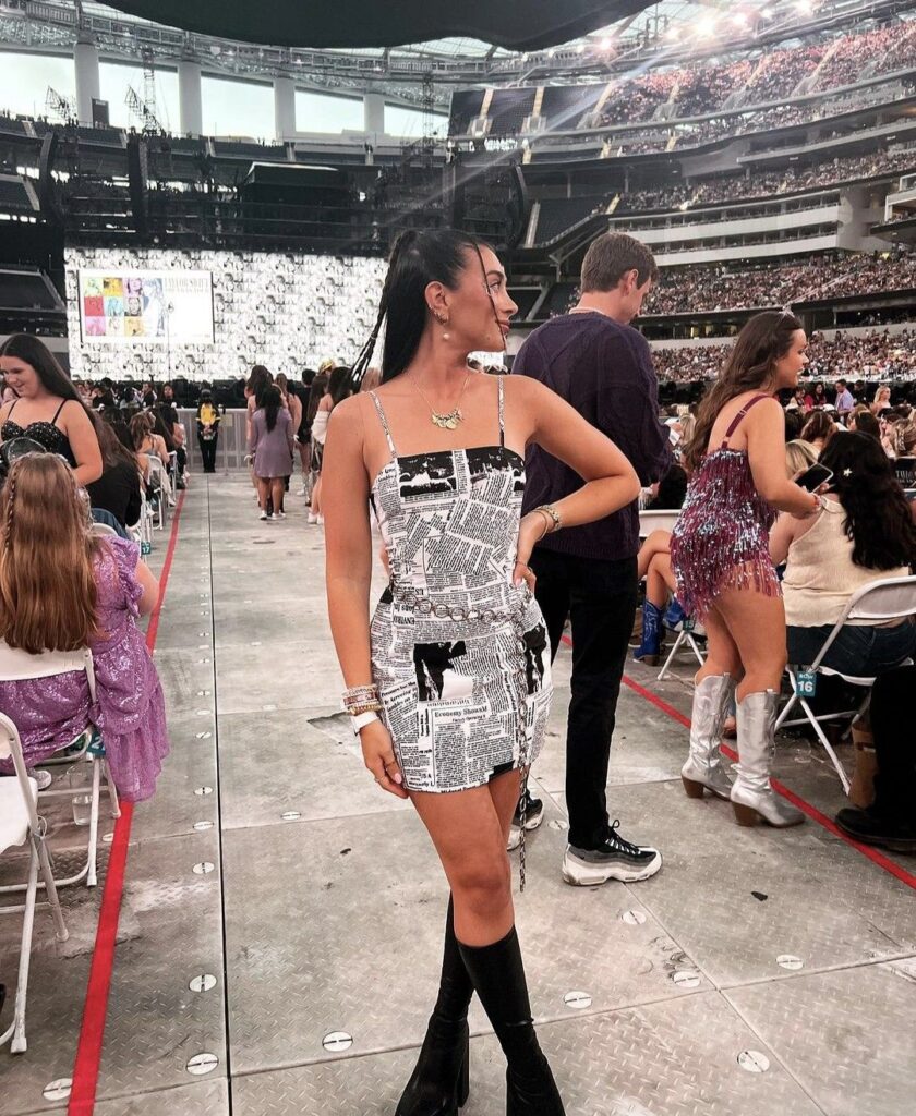 This is for the Swifties who did their research. A newsprint mini dress is such a specific nod to the whole media narrative era and it reads immediately at a show like this.