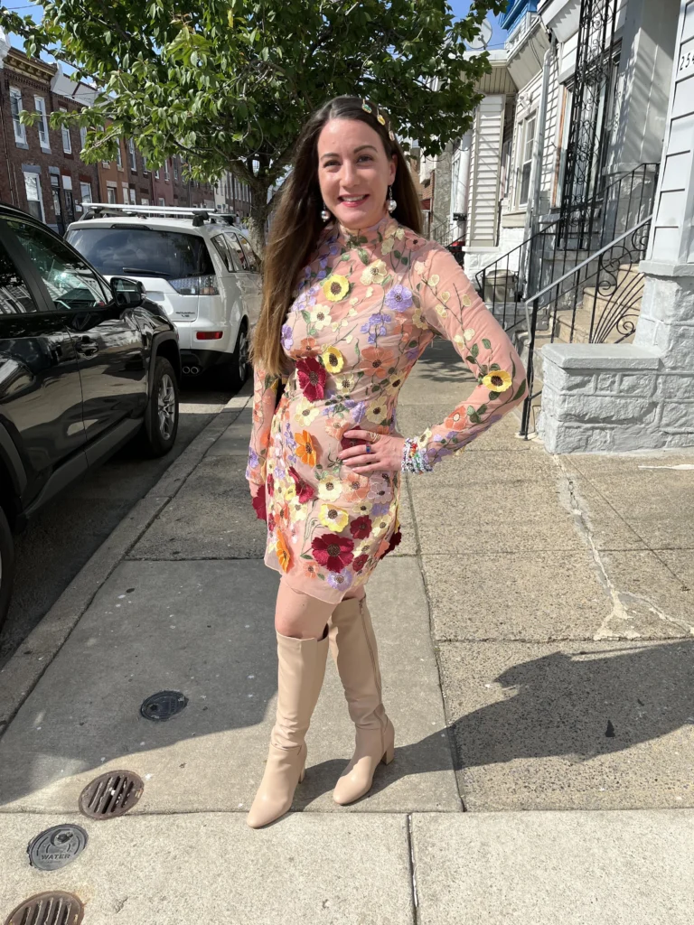 A sheer floral embroidered long sleeve mini dress with tall nude boots and pearl drop earrings.