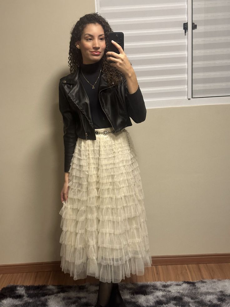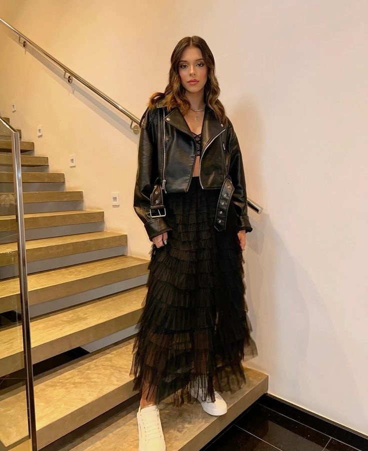 You know how people say all black is boring? Not when you add a leather jacket and a full tiered tulle skirt to the equation.