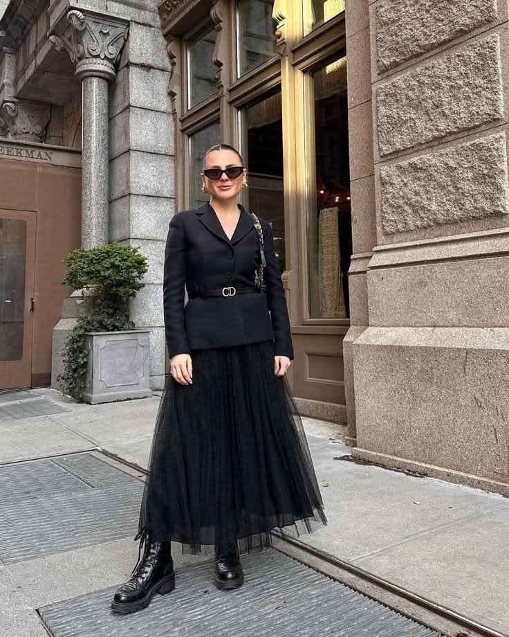 A sharp belted black blazer over a floor length black tulle skirt with chunky combat boots is basically a whole personality.