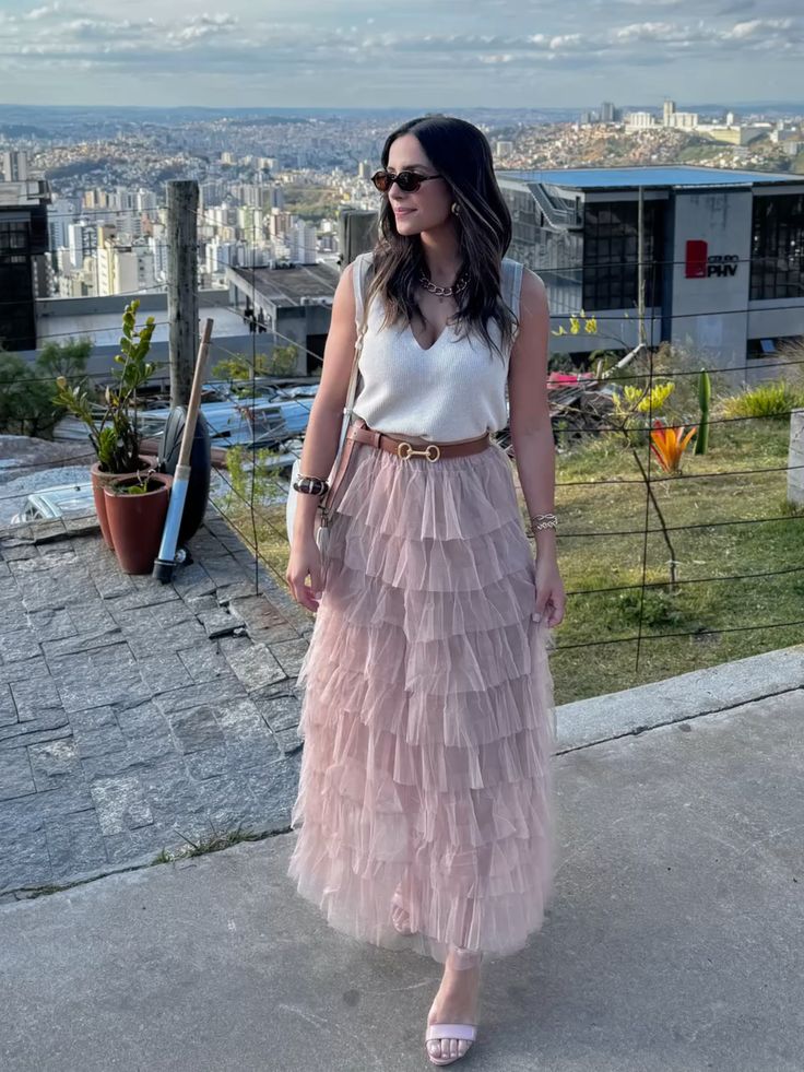 A fitted knit vest, tan belt cinching the waist over a blush layered tulle skirt, chain necklace, oversized sunglasses.