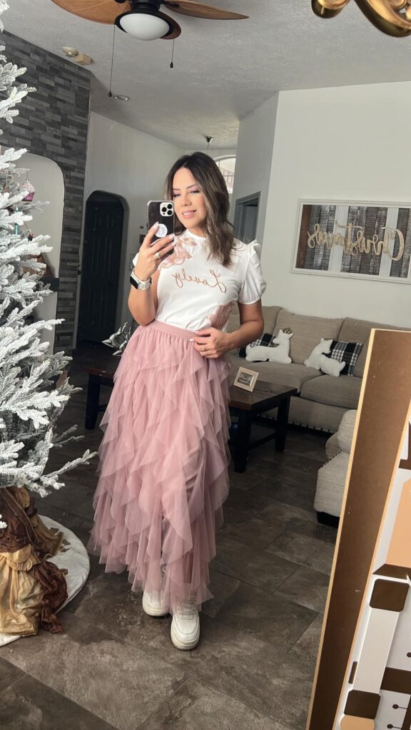 The knotted graphic tee over a dusty rose ruffled tulle skirt is giving casual meets whimsical in the best way possible.
