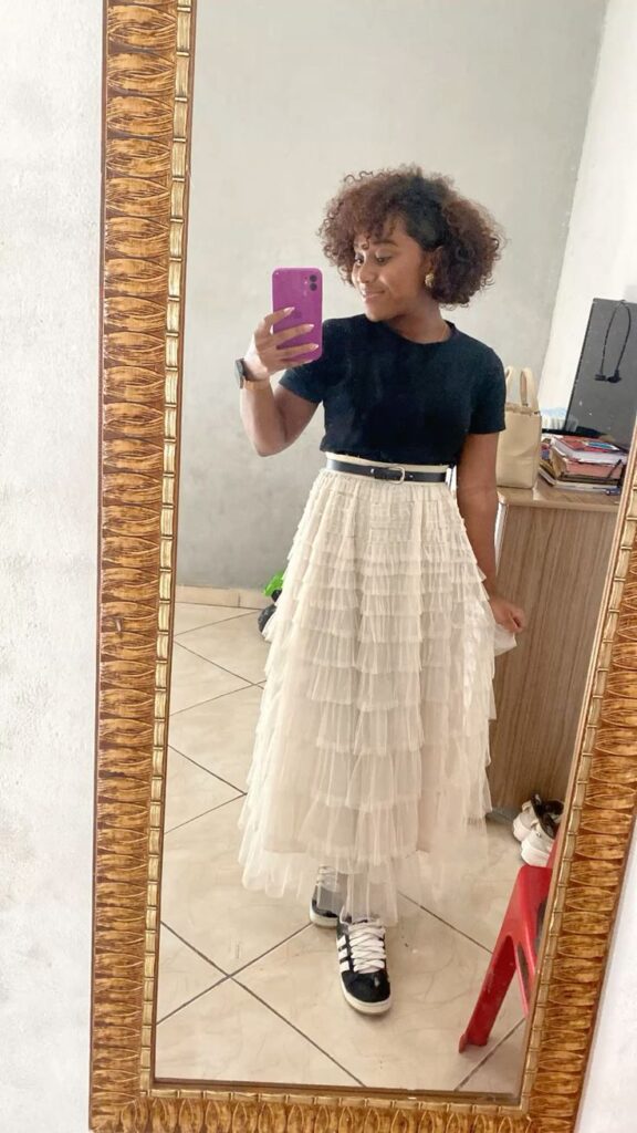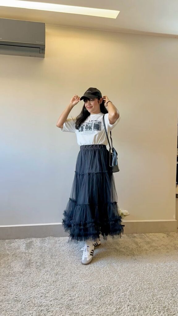 That slim black tee doing all the heavy lifting up top so the ivory ruffled skirt can fully shine below. I mean, the contrast is chef’s kiss.