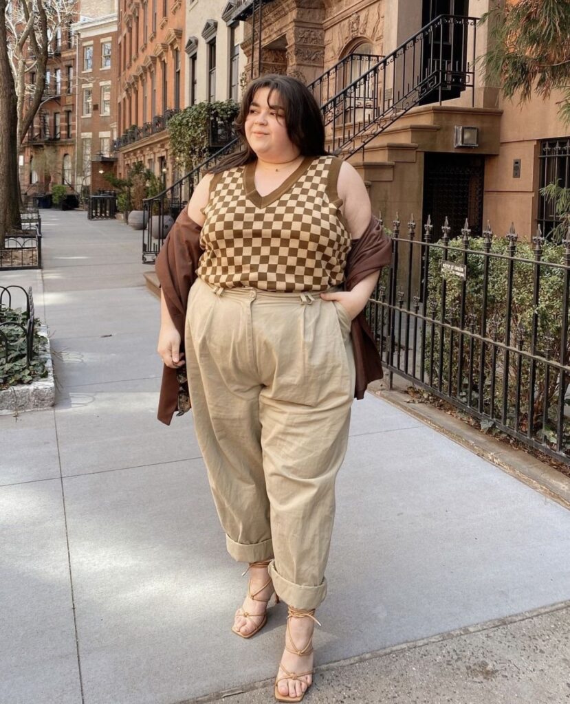 A brown and tan checkered knit vest over khaki wide leg trousers with lace up heeled sandals and a brown blazer thrown over one shoulder is such a thoughtfully put together look.