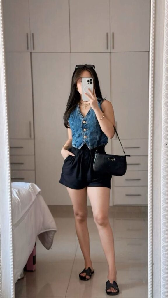 This is the summer uniform nobody talks about enough. A denim vest worn alone as a top over black shorts with slides and a crossbody bag.
