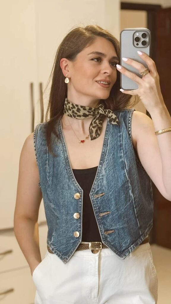 It’s that one small move that makes an otherwise simple outfit feel genuinely curated. The safety pin details on the vest add subtle edge. If you own a denim vest and a silk scarf, you literally already have this look.