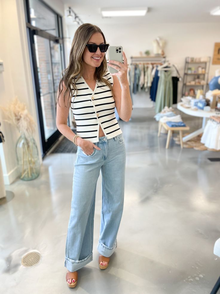 A striped knit vest with a collar detail over wide leg cuffed jeans and tan wedge sandals is such a fresh combination.