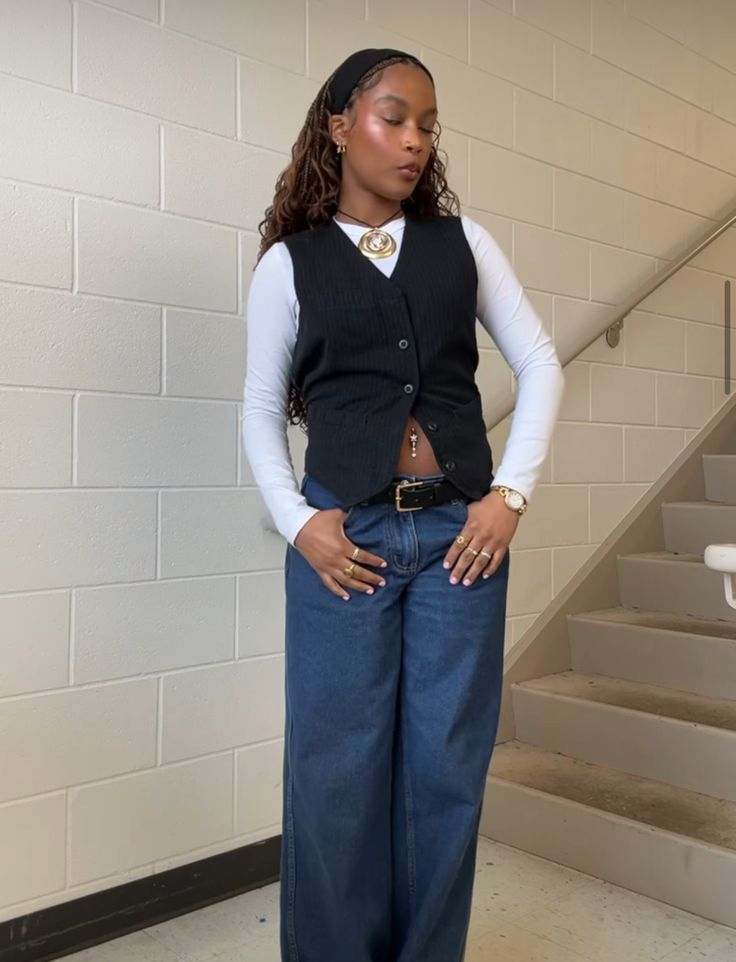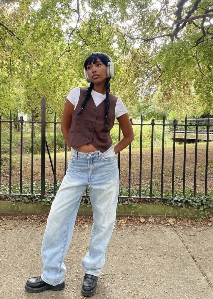 This one reads so cool and so unbothered. A chocolate brown vest over a white baby tee with light wash baggy jeans, chunky loafers and over ear headphones.
