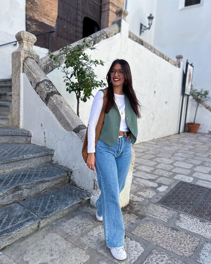 So simple it’s almost suspicious. A sage green vest over a white long sleeve with wide leg jeans, white sneakers and a tan tote.