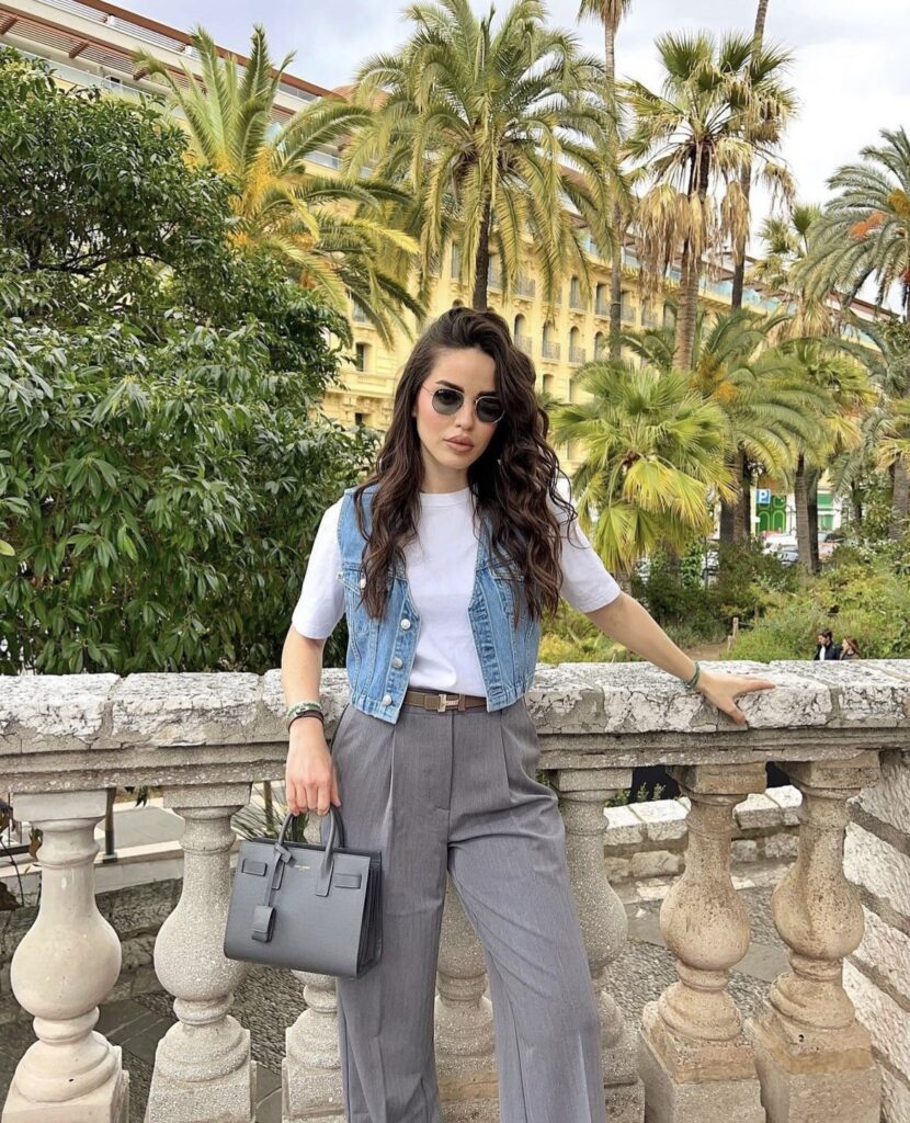 A cropped denim vest over a white tee with grey wide leg trousers and a structured bag is the kind of outfit that looks equally great on a European street or just running errands locally.