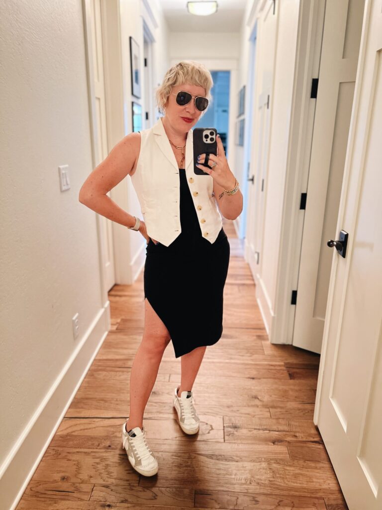 A white vest with gold button details layered over a black midi dress sounds like it shouldn’t work and yet it completely does.