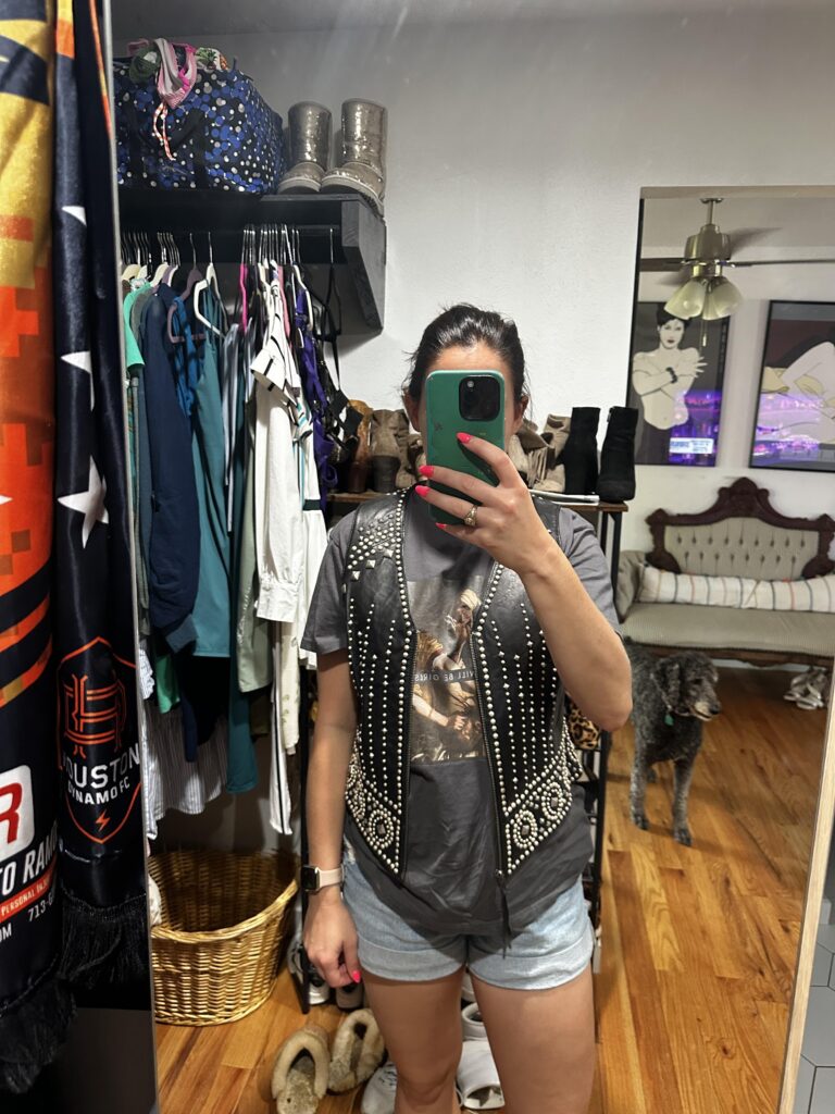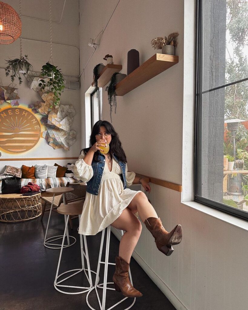 This technically isn’t a vest outfit, however it’s too good to skip. A flowy white mini dress, denim jacket, cowboy boots and a laid back coffee in hand energy.