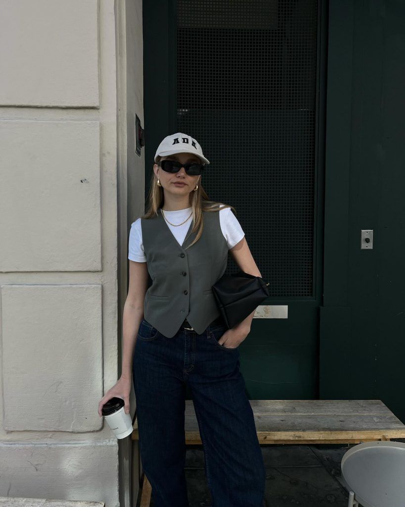 A grey tailored vest over a white tee with dark wash wide leg jeans, a cap, rectangle sunnies, gold hoops and a black leather bag is basically the perfect casual uniform.