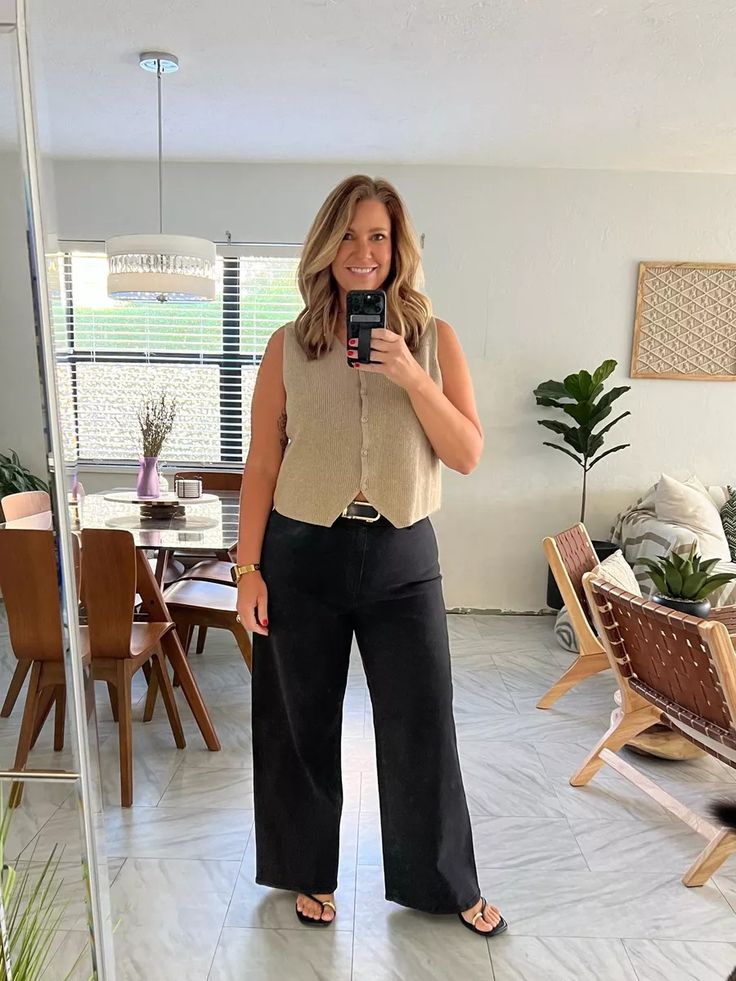 A cream linen vest over sage wide leg trousers with a tan belt and slide sandals is genuinely one of those outfits that looks expensive without being expensive.