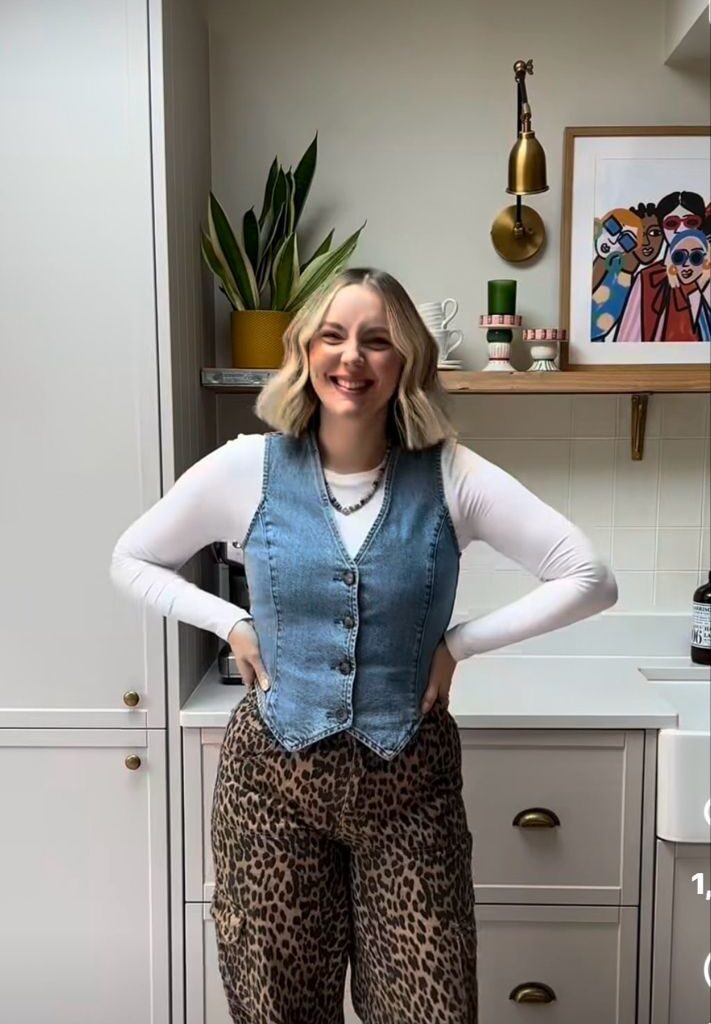 A denim vest layered over a white long sleeve with leopard print trousers is one of those combinations that sounds chaotic and looks completely brilliant. The denim grounds all that print energy and keeps it from going overboard.