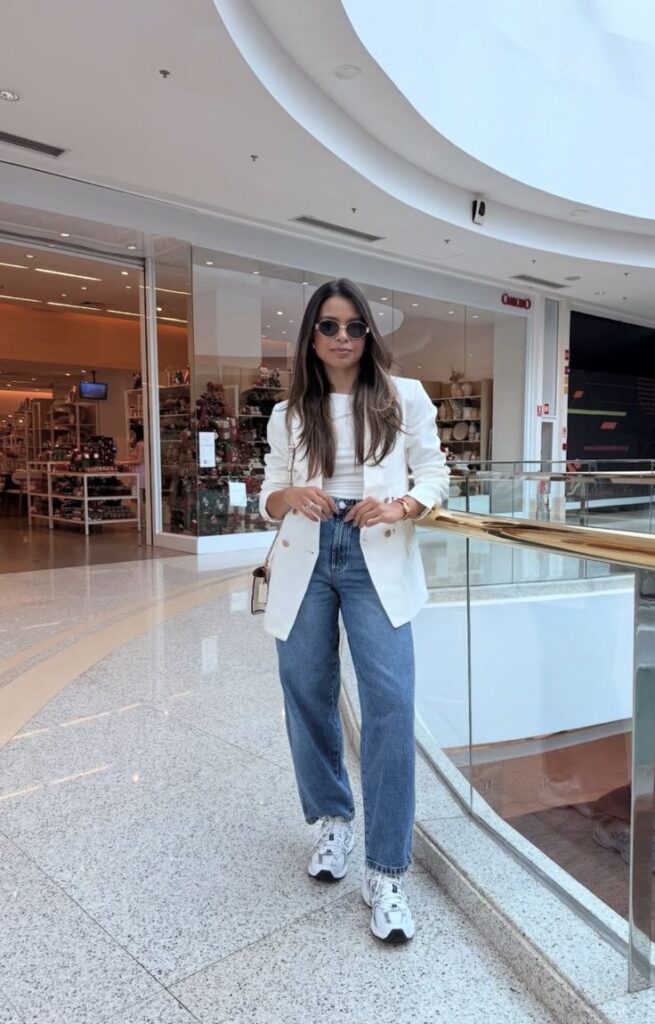 Gold buttons on a fitted white double breasted blazer immediately elevate whatever you pair it underneath. Light wash jeans and chunky sneakers keep it grounded so it never tips into overdressed.
