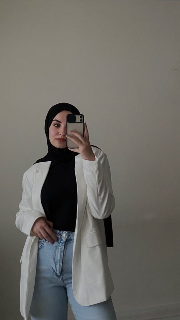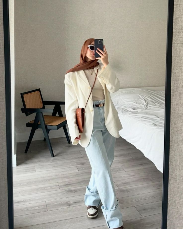 That caramel hijab with a cream blazer and coordinating bag is basically a masterclass in tonal dressing. The warm browns pull everything together so naturally it looks like it was planned by a professional.