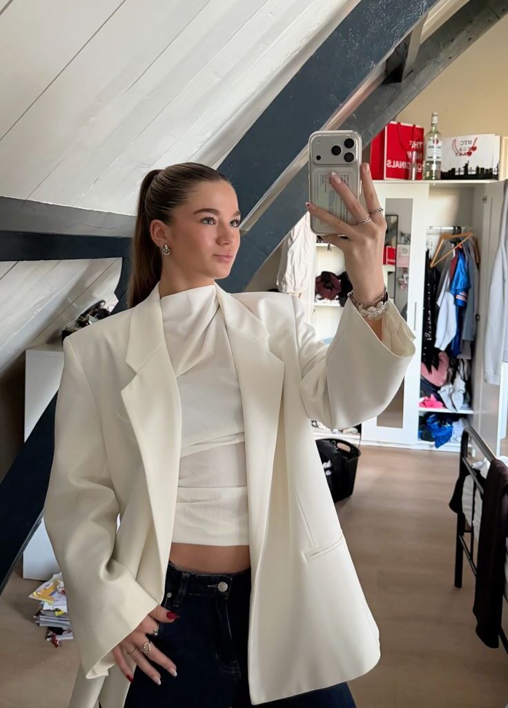 That structured blazer with serious shoulder definition worn open over a white crop top is genuinely giving main character.