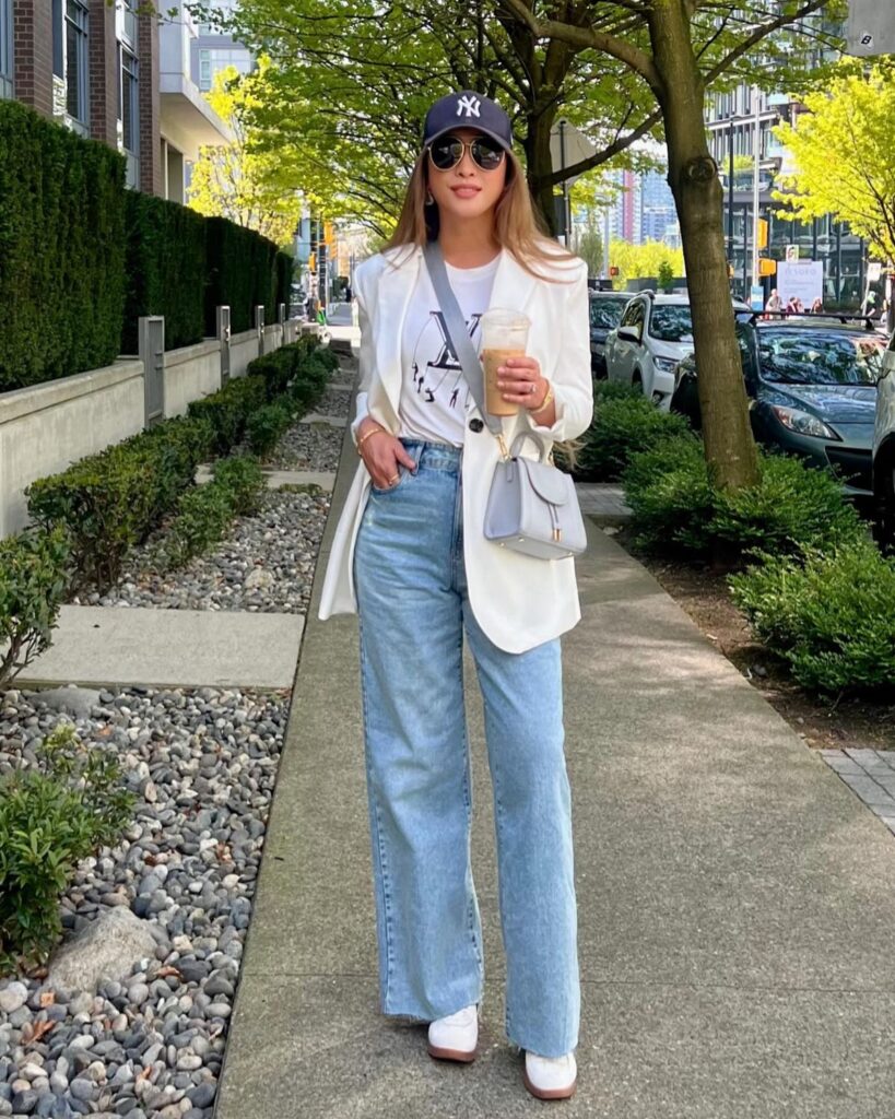 She is literally just walking down the street with a coffee and yet she looks like a whole mood. White blazer over a simple tee, super relaxed wide leg jeans and white sneakers.