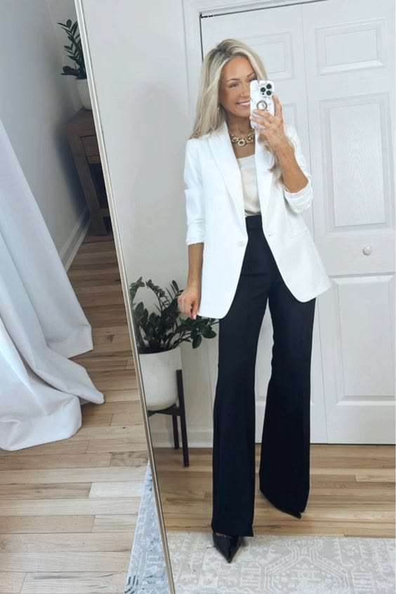 Black wide leg trousers, black pointed heels and a white blazer with a gold chain necklace. That is it. That is the whole formula and it works every single time.