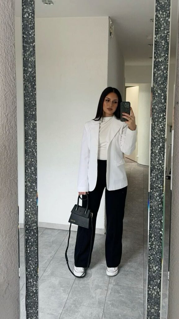 Pairing a white blazer with a cream fitted top and black wide leg trousers keeps things sleek without feeling boring. White Converse soften the formality just enough.