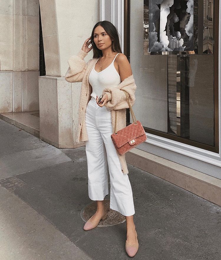 The oversized teddy cardigan draped casually over a white cami, with wide white jeans and blush flats creates this relaxed, feminine energy that works for a coffee run, a gallery visit, a casual dinner.