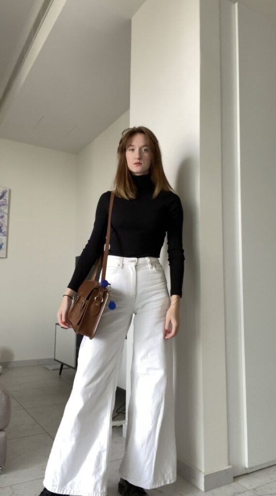 A fitted black turtleneck tucked into wide leg white denim is basically a shortcut to looking like you have an incredibly curated wardrobe, even if you threw it together in five minutes.