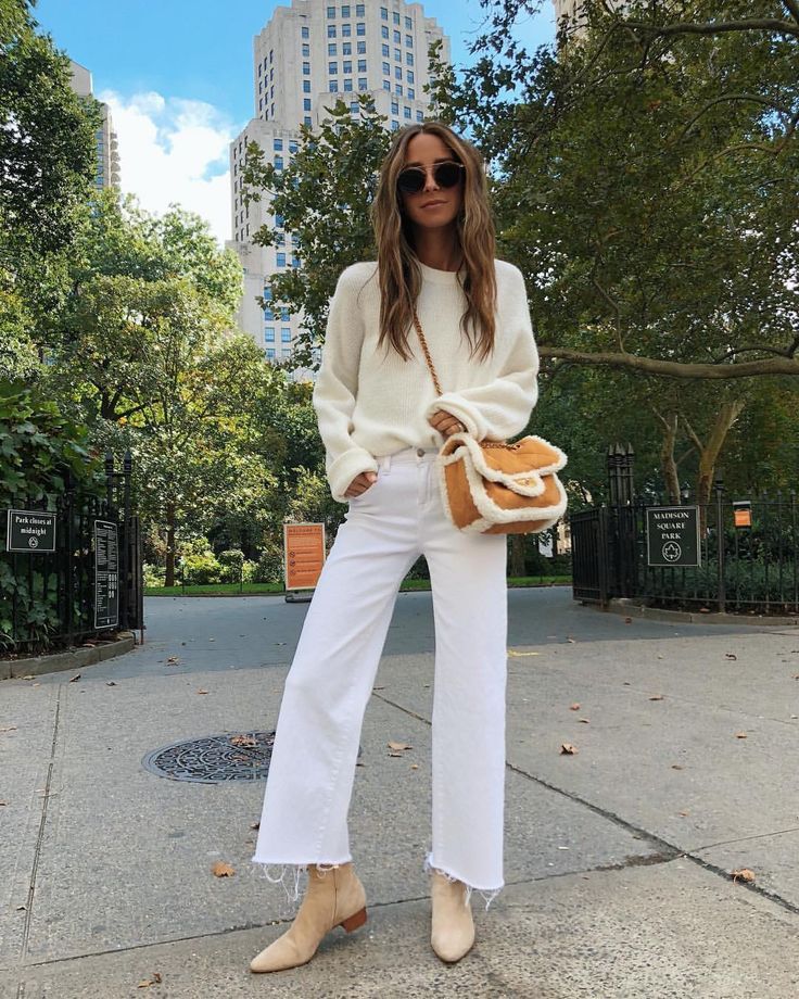A fluffy cream knit paired with white flares is one of those tonal combinations that looks so intentional it almost feels like cheating.