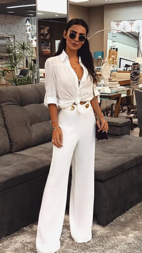 Knot a White Shirt Over Gold Button White Flares for That Polished All White Look