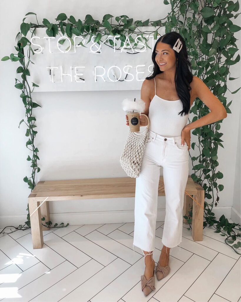 A fitted white bodysuit tucked into white straight leg or wide flares, finished with bow detail flats and a macrame bag, reads incredibly chic in the most understated way possible.