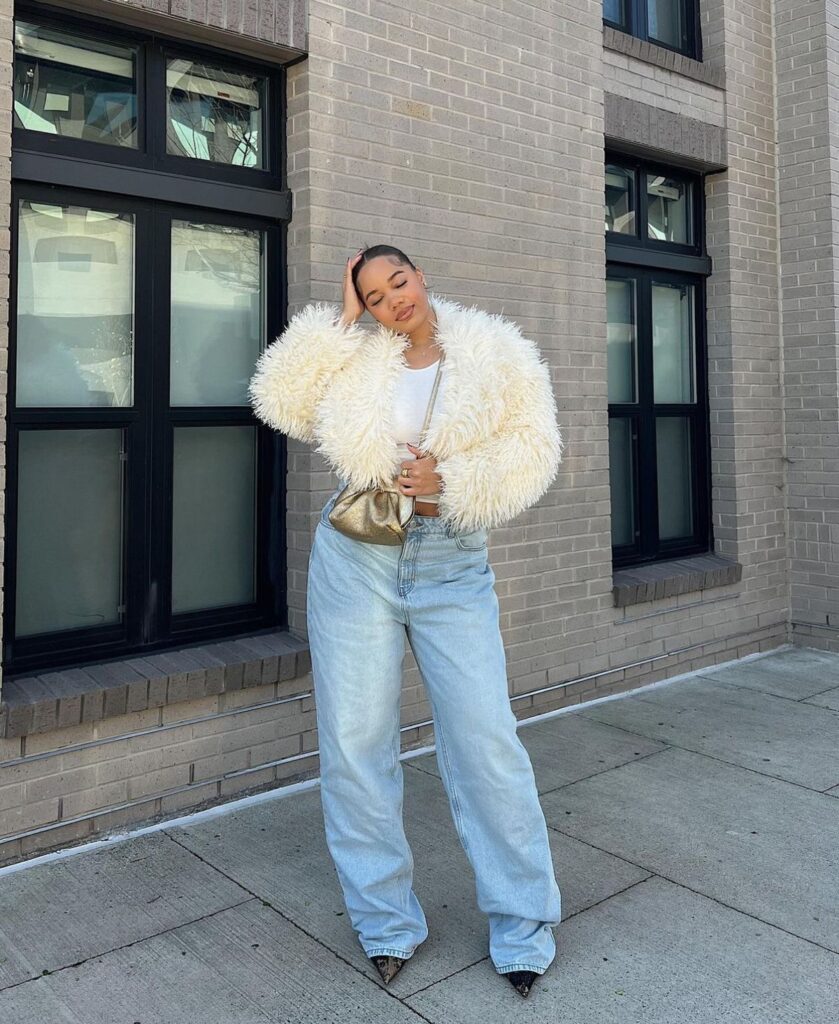 Pairing a cropped fur with light wash baggy jeans creates this really fresh, modern look that feels less heavy than darker denim.