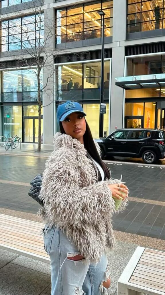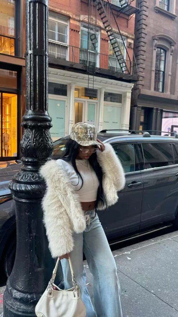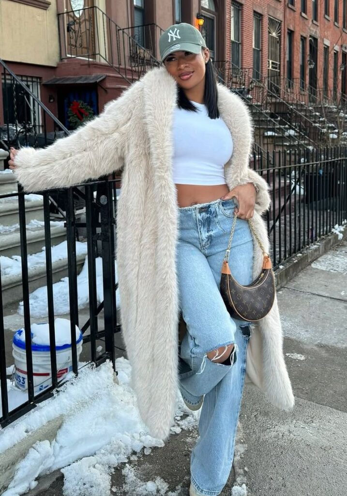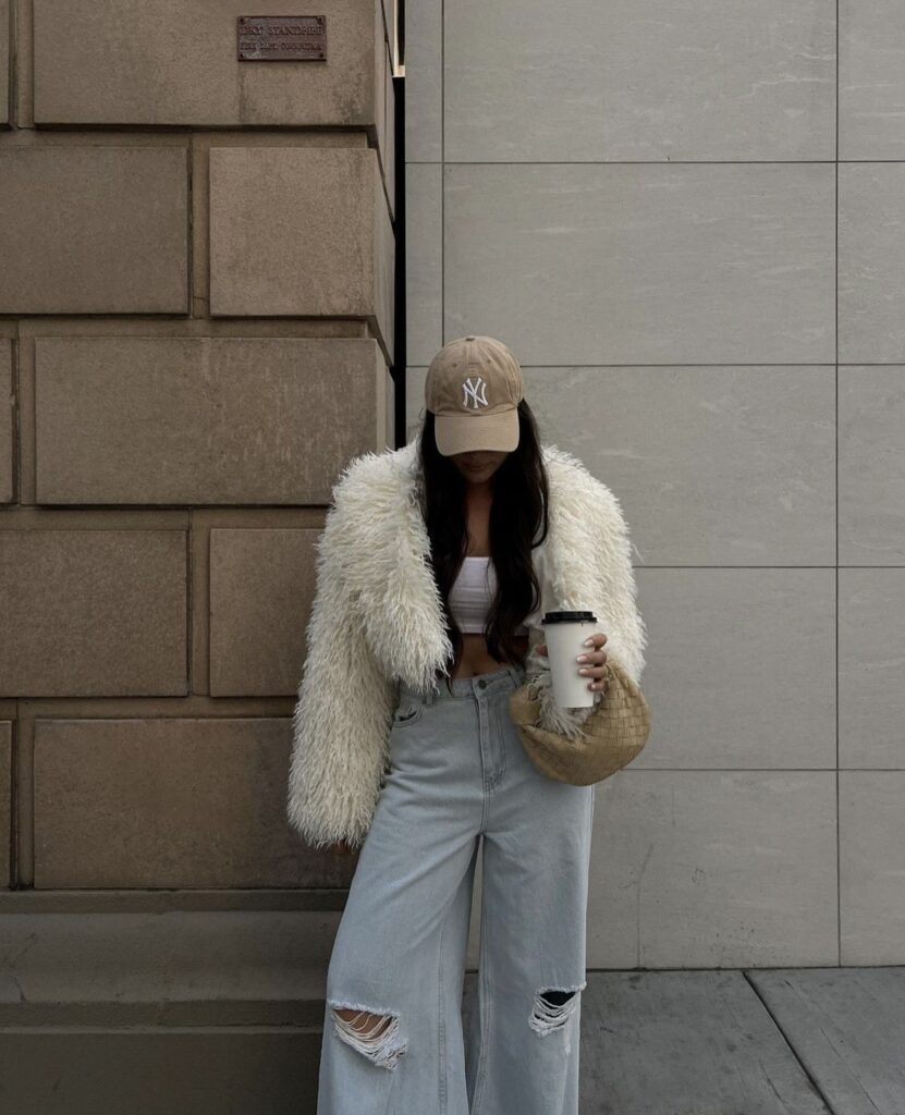 There’s something genius about throwing a luxe fur coat over a basic crop top and distressed jeans with a baseball cap.