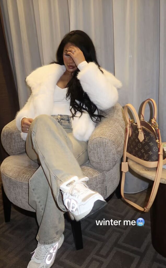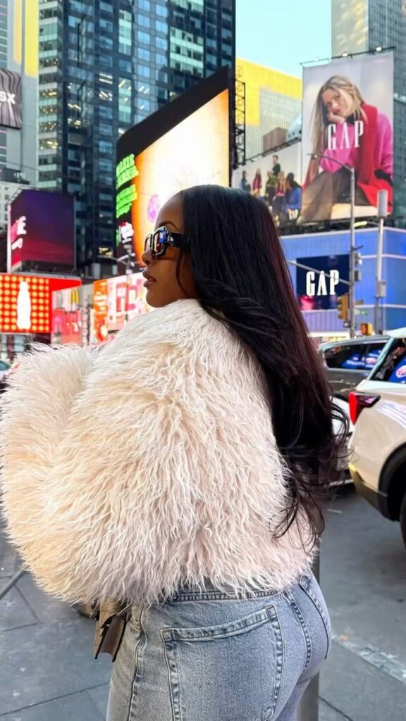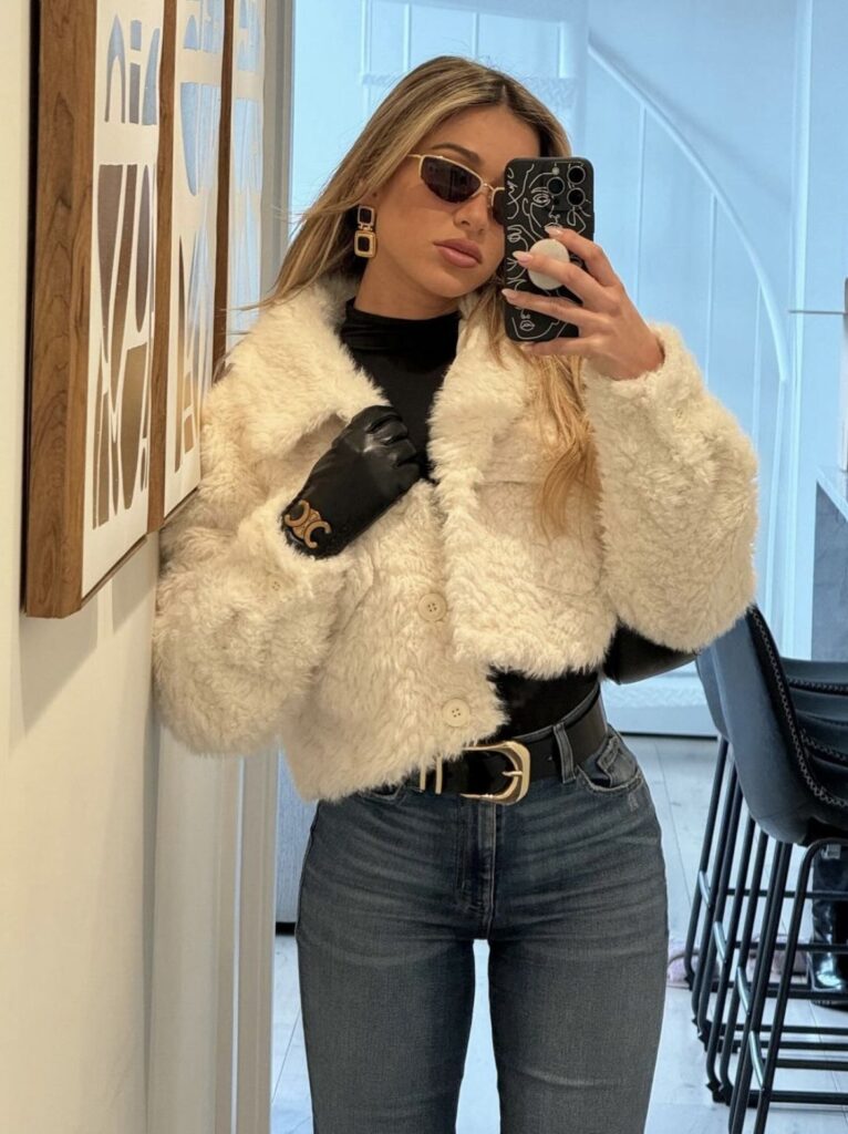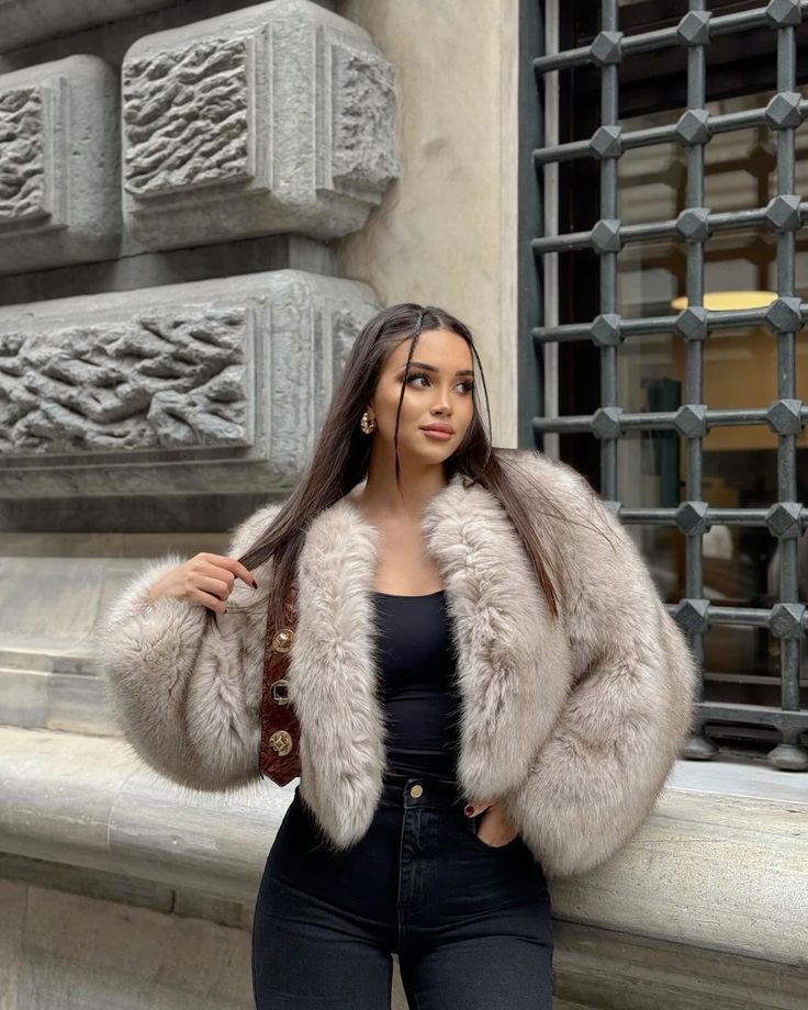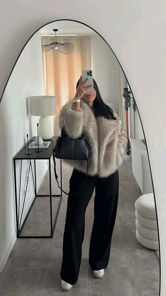 If you’re into making a statement, this cropped fur with those exaggerated sleeves is it. The drama of the coat paired with simple black basics underneath creates this really editorial moment that photographs insanely well.