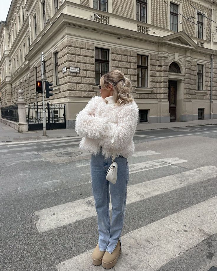 The shaggy fur with straight leg jeans and platform clogs creates this really cohesive, monochromatic moment that feels sophisticated.