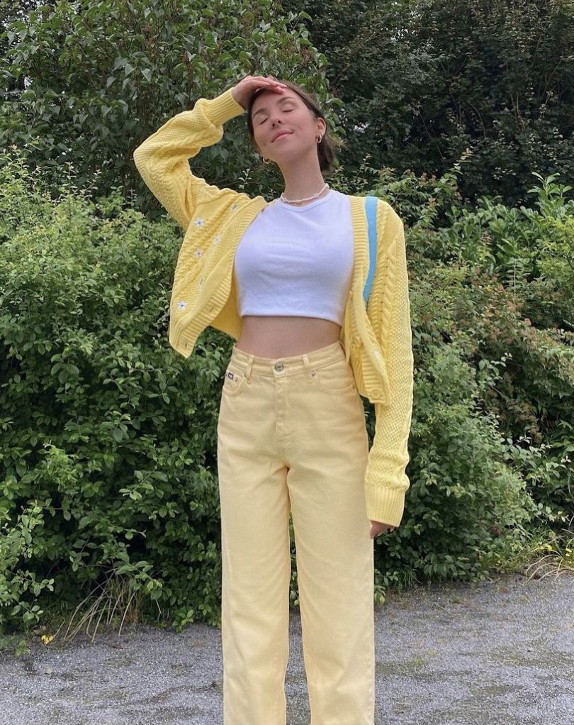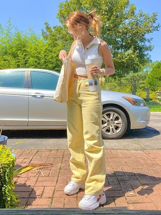 The white cropped polo vest with butter yellow wide jeans and chunky white sneakers has such a sporty fresh energy. It is casual but not lazy.